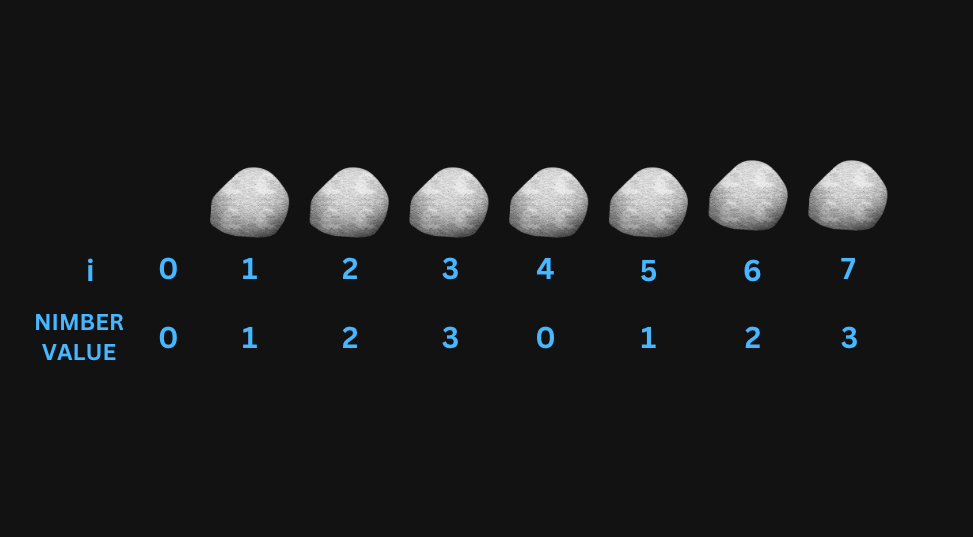 According to the theorem, the nimber value is the mex\text{mex} of the reachable nimber value. In the case of this game, each state can reach the previous 33 values because we can only remove 1, 2 or 3 stones in one move.